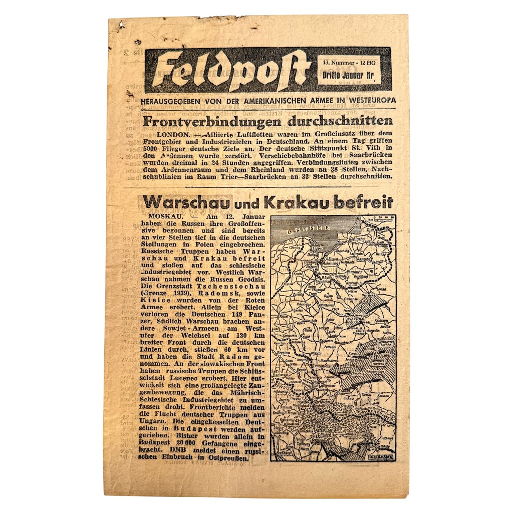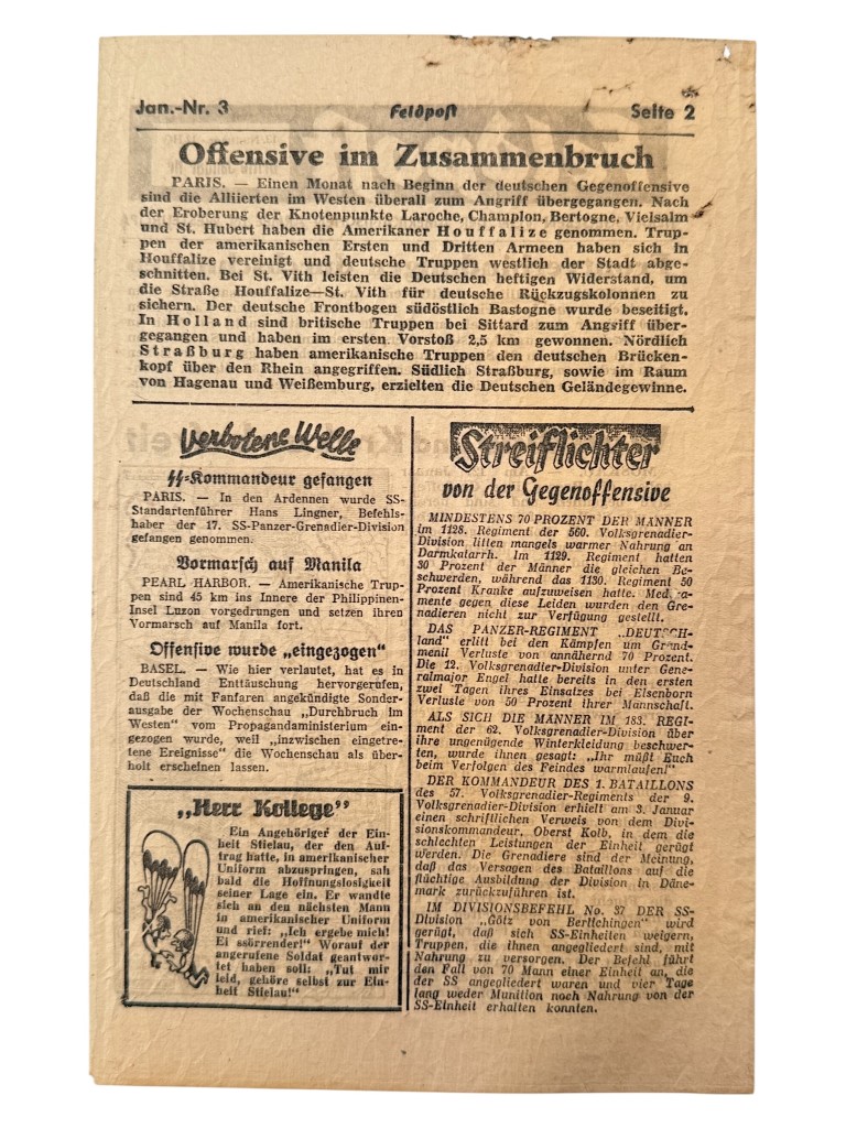This Allied propaganda leaflet, designed as a forged edition of Feldpost and dating from the final phase of the Second World War, is a striking example of Allied psychological warfare. The leaflet disseminates strategic disinformation in the style of a newspaper, featuring articles on front-line breakthroughs, German troop losses, and the successes of Allied and Soviet forces, including the liberation of Warsaw and Krakow. Through its realistic newspaper layout and detailed reporting, it aimed to undermine confidence in the German command and create the impression that defeat was inevitable.