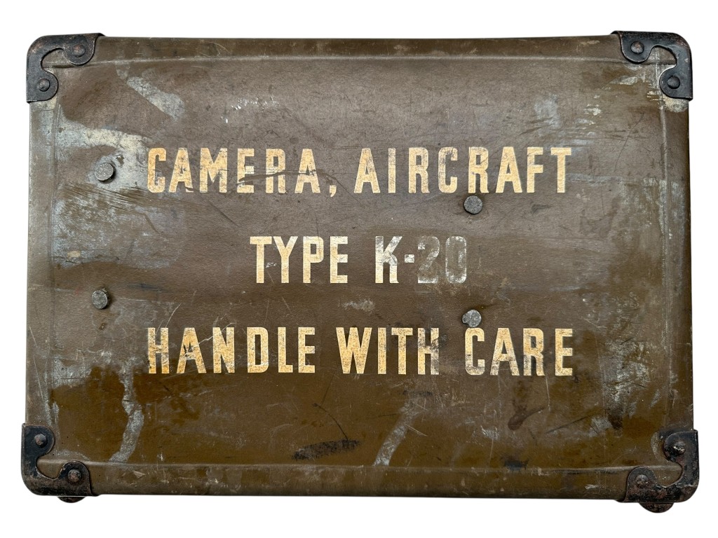 Original American Camera, Aircraft Type K-20 aerial reconnaissance camera dated 1943, complete with its matching wooden transport case stenciled “CAMERA, AIRCRAFT TYPE K-20 – HANDLE WITH CARE.”