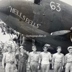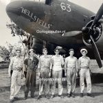 De groot formaat USAAF foto is in goede conditie en daarop zijn de bemanningsleden van het transportvliegtuig ‘Hells Bells’ te zien op 14 februari 1943 in New Guinea.