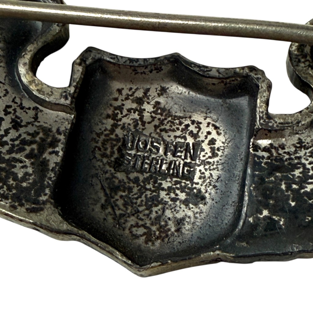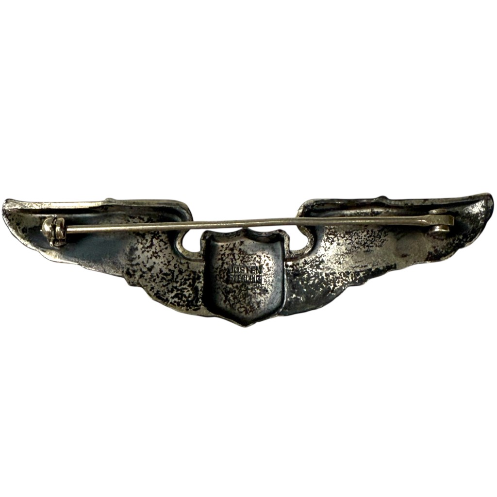Original USAAF pilot wing from the Second World War, made of sterling silver and clearly marked “STERLING” on the reverse.