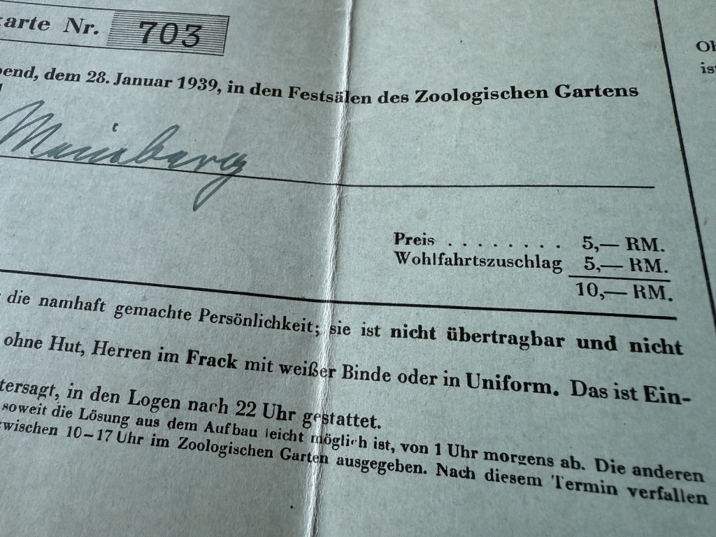The set consists of several authentic paper items, including a membership card (no. 703) issued to a gentleman and an admission ticket (no. 1263) issued to a lady, both dated Saturday, 28 January 1939, and valid for the ballroom halls of the Zoological Garden in Berlin.